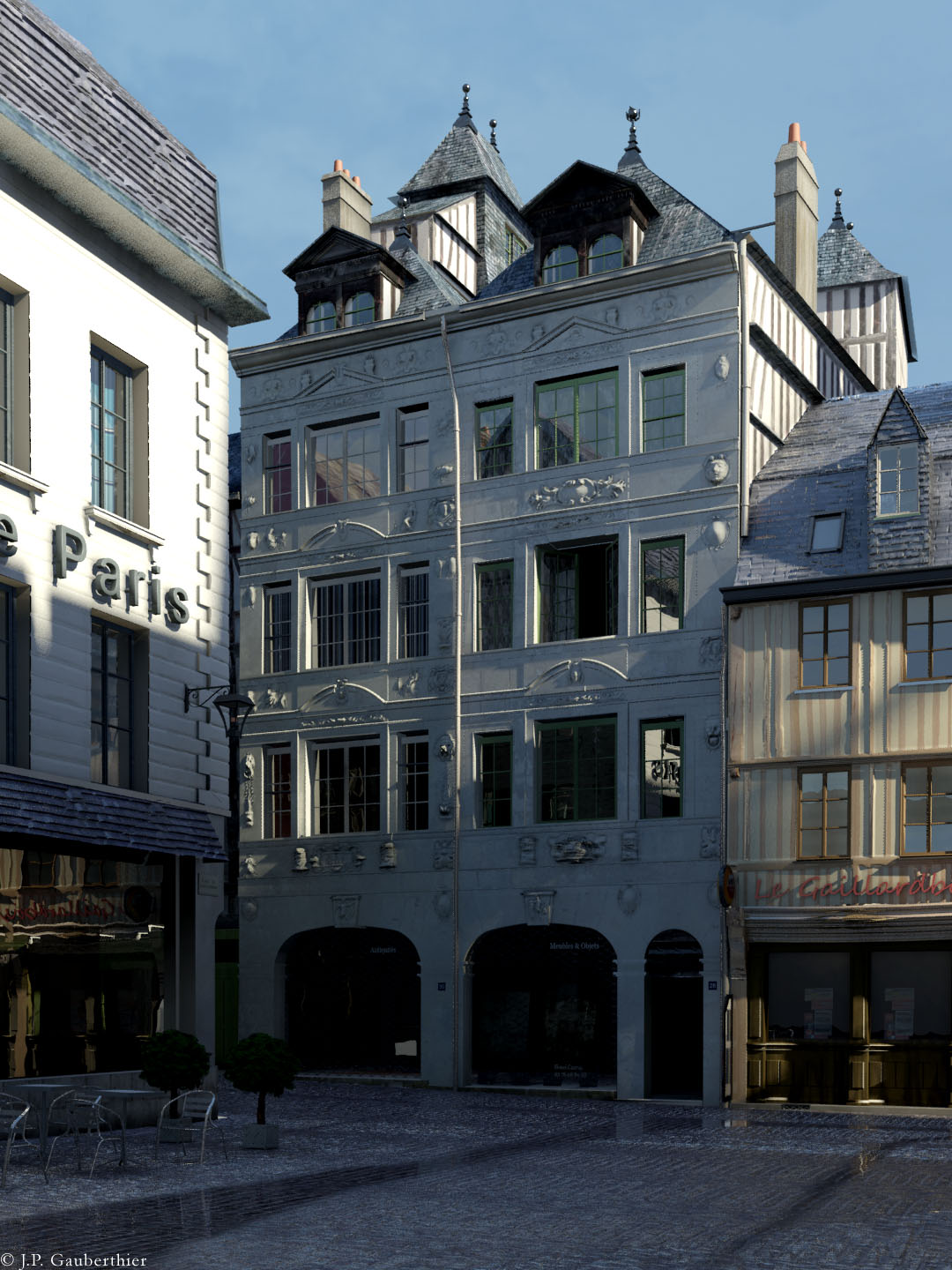 Place du Gaillardbois : this little square had replaced the graveyard ot the nearby Saint-Cande-le-Vieux church. It opened onto rue du Bac and connected with rue de la Savonnerie via a narrow street. It was flanked by a remarkable XVIIth century house (28-30 rue du Bac) with a richly carved stone facade